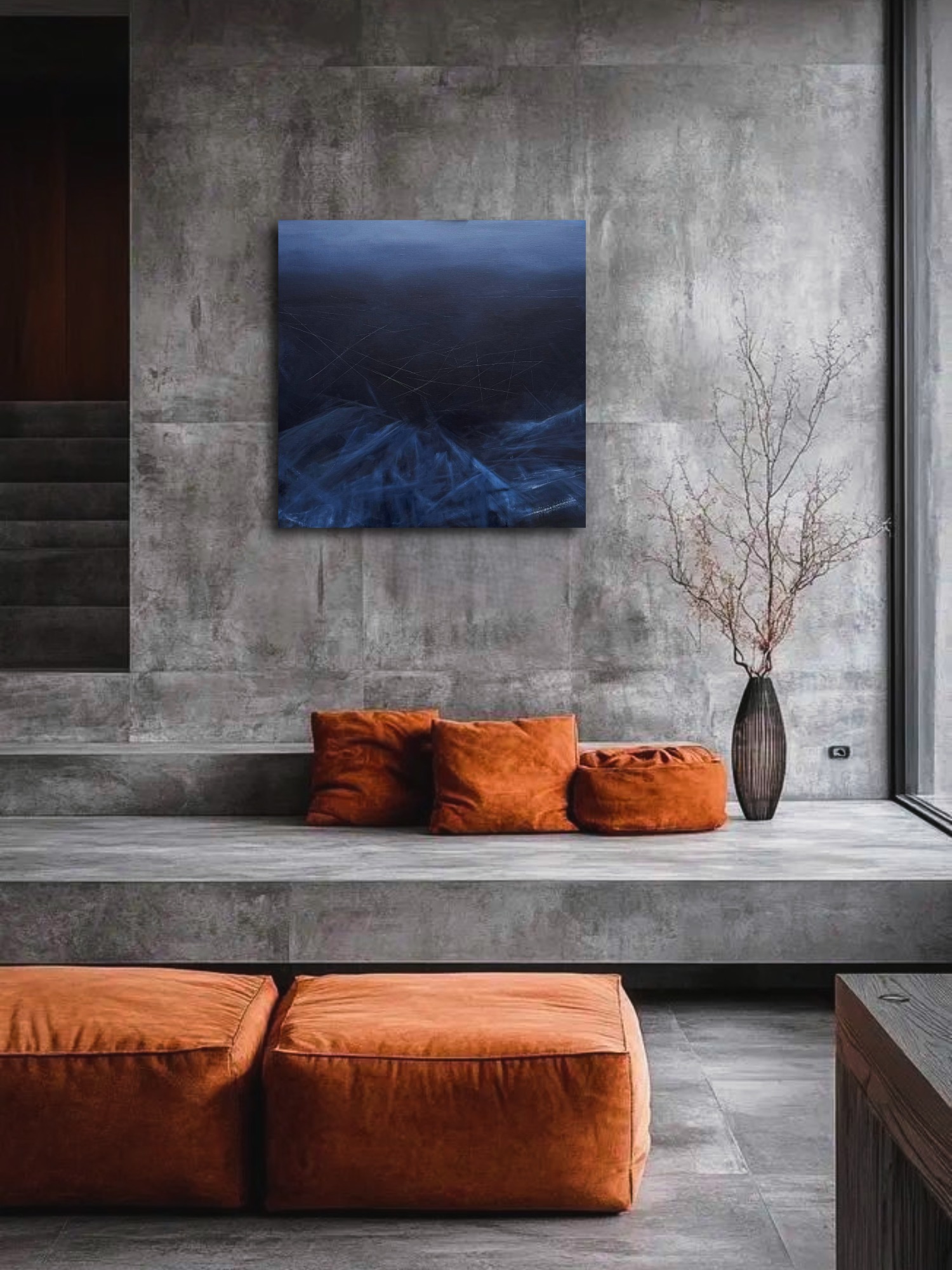 * масштабная работа с геометричными элементами для структурирования пространства вокруг себя; океанический синий и штрихи создают аллюзию с чистыми глубокими водами Байкала, покрытыми толщей прозрачного льда и следами от коньков на его ещё недавно идеальной нетронутой поверхности