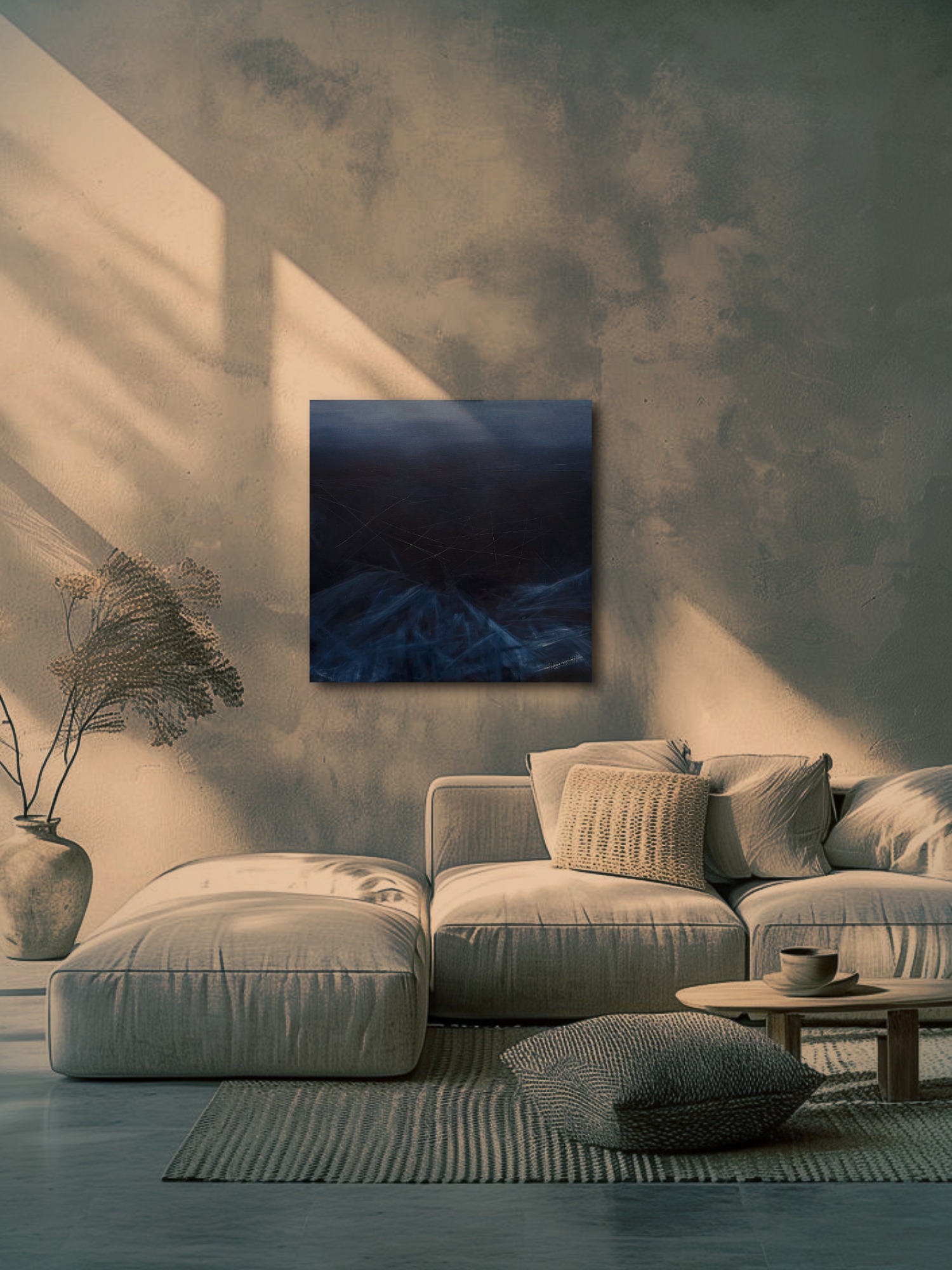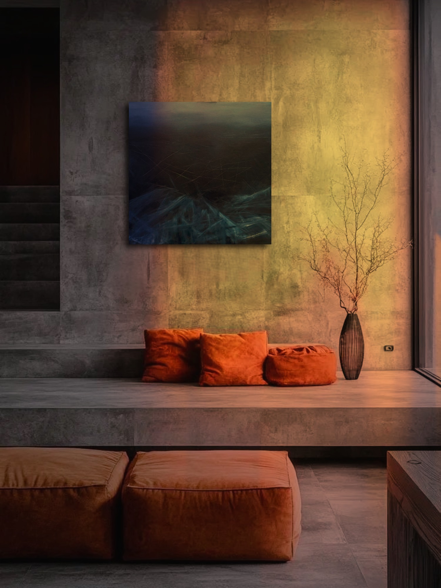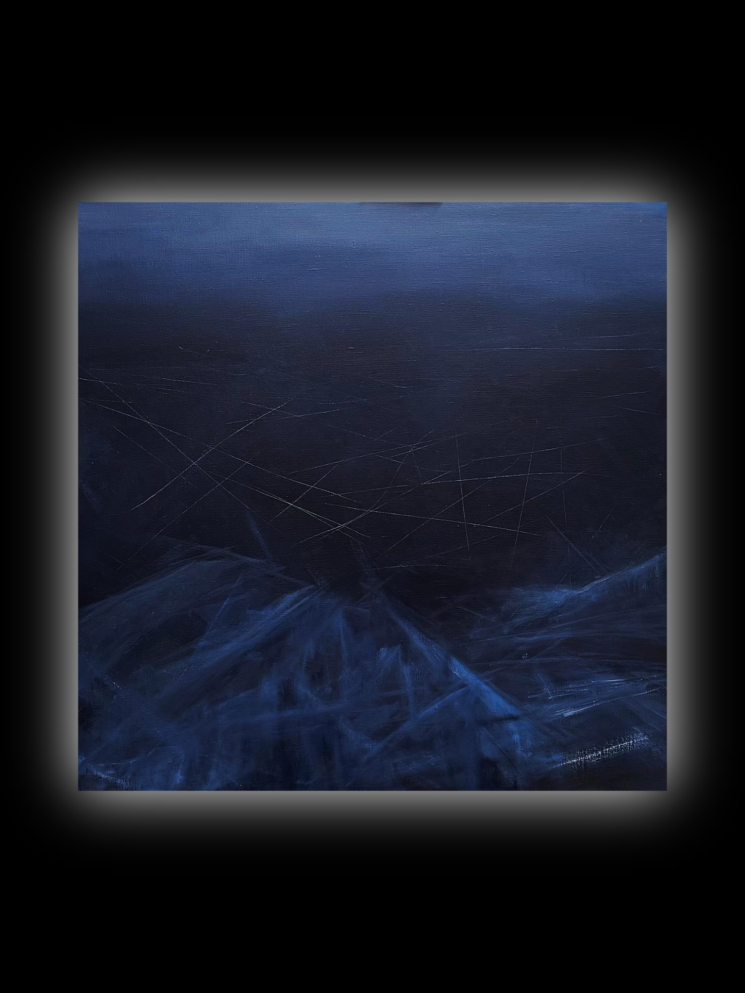 Говорит автор: В этой работе внутреннее состояние проявляется через плотность цвета, резкие ритмы и следы прямого воздействия на холст. Холодная глубина, поцарапанная поверхность и осколочные штрихи создают ощущение застывшего напряжения. Все внешнее исчезает, есть только «Я» наедине со своим ощущением.
