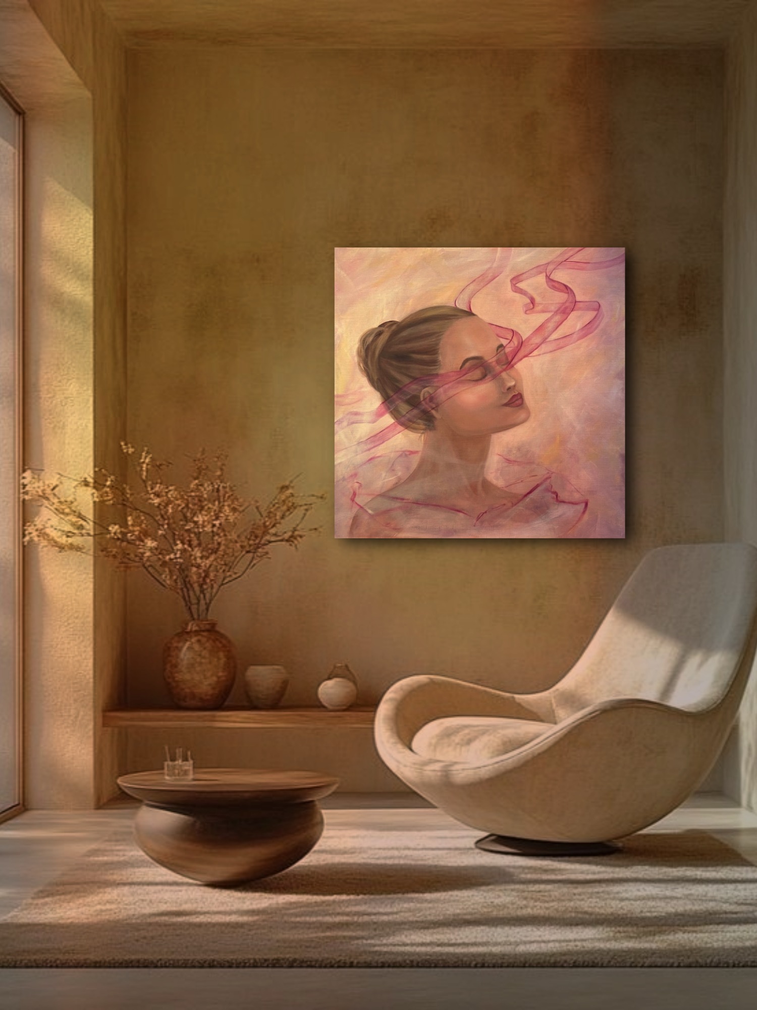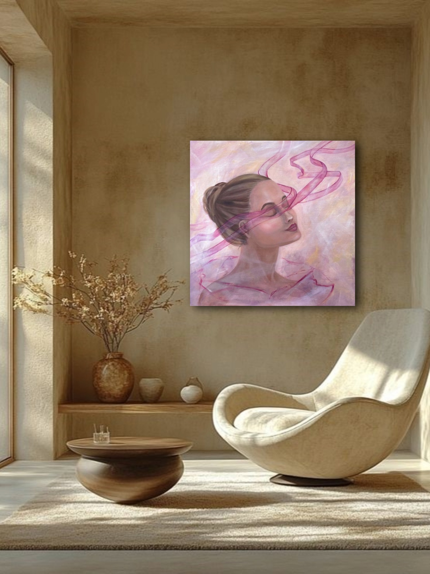 Говорит автор: Девушка с глазами, закрытыми лентами, появляется как образ лиминального состояния влюблённости, в котором размываются привычные стратегии поведения. Жест закрытых глаз отражает одновременно доверие и уязвимость, неизбежные в процессе женского взросления. Ленты символизируют доверие, мечту и иллюзорность. Это образ 'liminal space' - перехода между тем, что уже известно, и тем, что только начинает формироваться. Картина исследует хрупкое напряжение между надеждой, фантазией и иллюзией, возникающее в момент, когда чувство ещё только набирает силу.